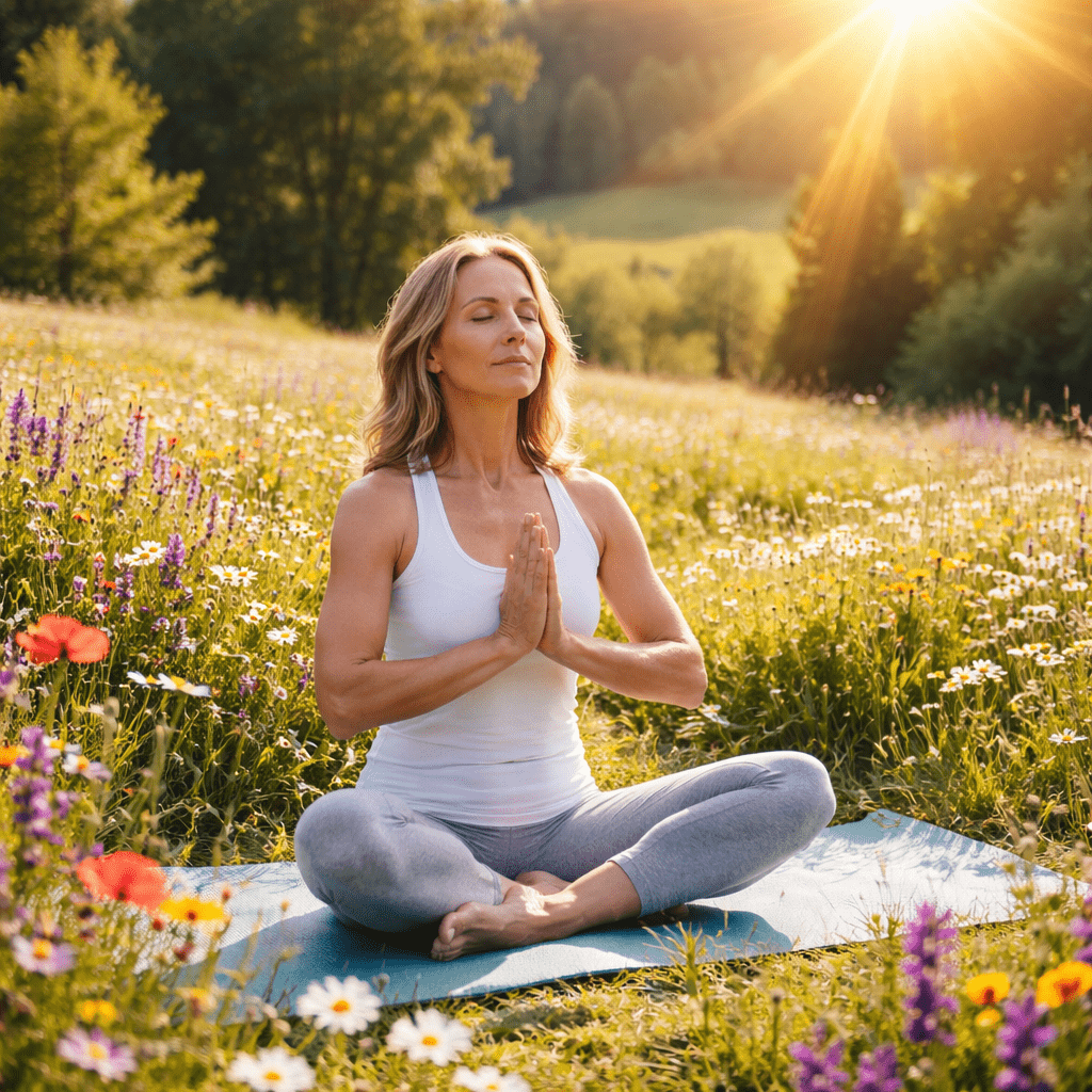Žena cvičí jógu na rozkvetlé louce jako přirozená prevence osteoporózy